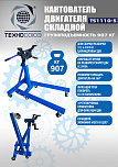 Складной. Для сборки / разборки цилиндропоршневой группы 6-х цилиндровых ДВС с навесным оборудованием и 8 цилиндровых без навесного оборудования г/п. до 907 кг. Позволяет вращать двигатель на 360°. С 4-мя регулируемыми кронштейнами для удобства вывешивания и обслуживания ДВС легковых авто. Оснащен П - образной рамой с 6 поворотными колесами.