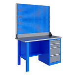 Однотумбовый. Допустимая нагрузка на столешницу 750 кг. Опорные элементы выполнены сварными из холоднокатаной стали. Верстак состоит из столешницы, опоры, тумбы P5 с четырьмя малыми и одним большим ящиком, полки-стенки, двойного экрана с кронштейнами. Столешница состоит из фанеры марки ФСФ толщиной 24 мм, которая покрыта лаком-антисептиком и листом оцинкованной холоднокатаной стали толщиной 1,2 мм. Размеры (ВхШхГ) 1965x1396x696 мм.
