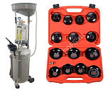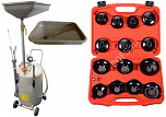 Комплект из TS-2097 маслосборника. Для быстрого слива и откачки щупами масла и антифриза из ДВС, КПП и дифференциалов всех авто. В комплекте: Колба с особо прочным пластиком. Сливная чаша с сеткой для улавливания мелких деталей. Щупы гибкие 6 шт. Лоток для сливной пробки. Прозрачная трубка контроля в защитном кожухе. Металлические пистолеты для откачки масла. Вмещает 90 л. = Бак 70л + колба 10 л. + сливная воронка 10л + ES0901 Набор съемников масляных фильтров ("чашки") - 15 шт.