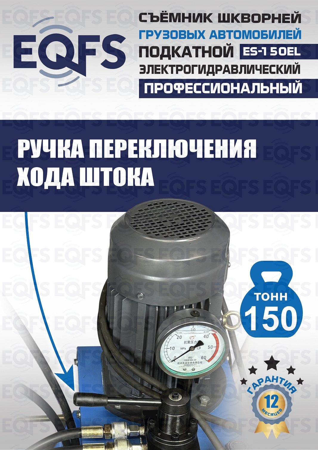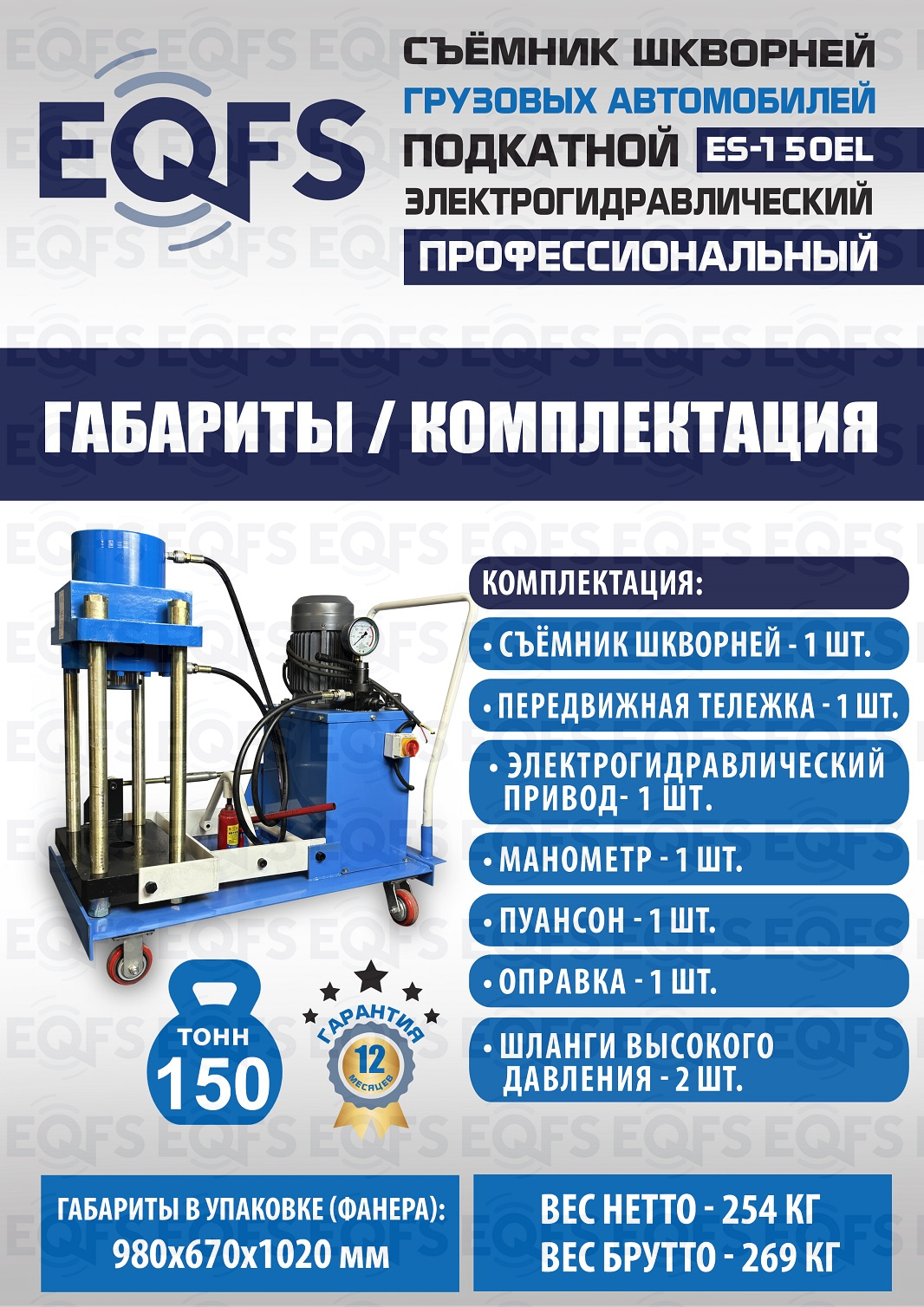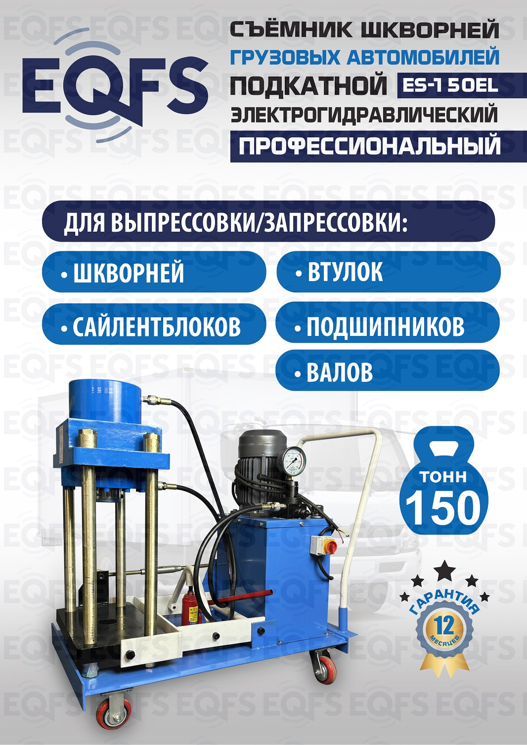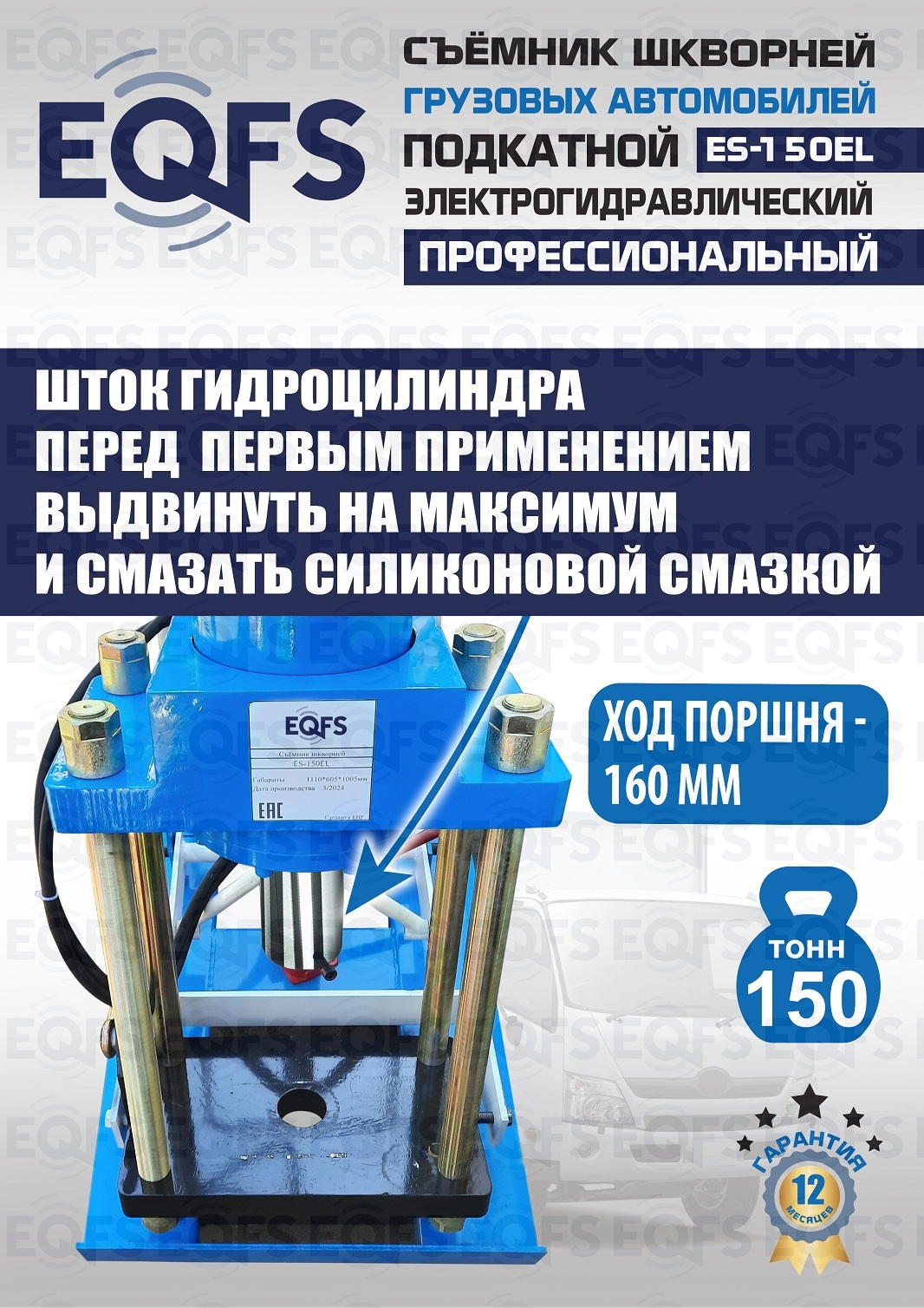 Сокращает время ремонта. Позволяет работать под разными углами 1 человеку. Мобильный. Для выпрессовки шкворней из поворотной цапфы погрузчиков, тракторов, строительной техники, коммерческих и грузовых авто отечественного и импортного производства: MAN, MERCEDES, SCANIA, VOLVO, Корейские и Китайские авто. Электрогидравлический привод. Рабочее окно 400x320 мм. Усилие 150 тонн.