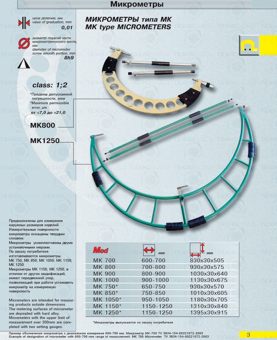 Пример условного обозначения микрометра гладкого с диапазоном измерения от 600 до 700 мм класса точности 1 - Микрометр МК 700-1 ТУ 3934-154-00221072-2003.