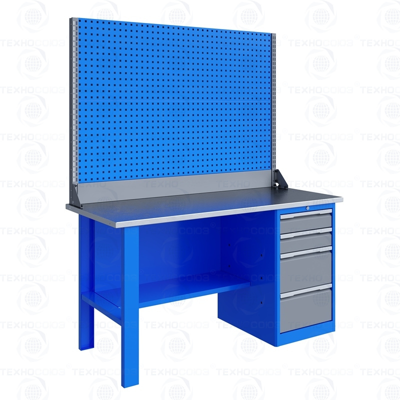Однотумбовый. Допустимая нагрузка на столешницу 750 кг. Опорные элементы выполнены сварными из холоднокатаной стали. Для выполнения сборочных, ремонтных, слесарных, монтажных и других видов работ на производстве, в сервисных центрах, мастерских, гаражах, а также для обучения технологии в учебных заведениях. Комплектуется полкой-стенкой, расположенной под столешницей для удобного размещения габаритного инструмента и оснастки. Размеры верстака: 855x1596x696 мм. Вес: 83 кг. Поставляется в 4 комплектациях на выбор.